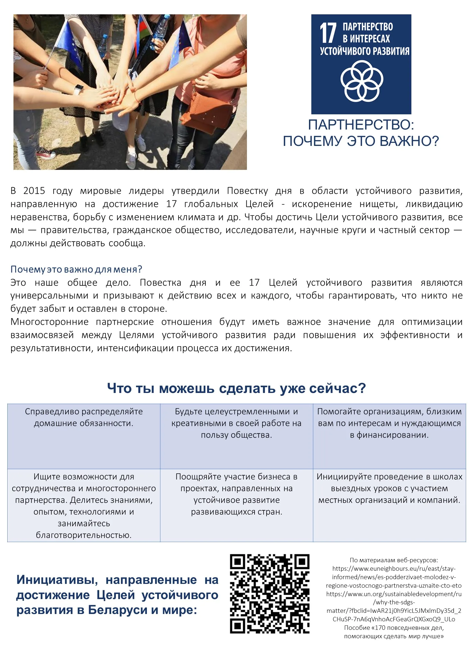 In order to increase the involvement of schoolchildren and students in the process of achieving the Sustainable Development Goals, the Coordination Center “Education for Sustainable Development” of BSPU has developed a series of posters “Sustainable Development Goals. Let’s Achieve Together” and methodological recommendations for conducting classes using them, which will allow to organize a discussion of the 2030 Agenda with schoolchildren and students in an interactive format.